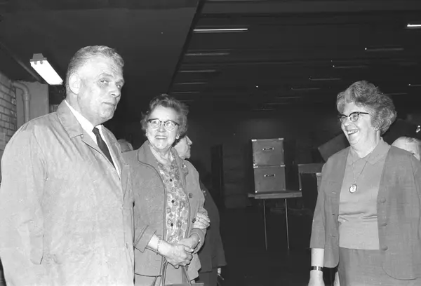 Fabrikkinteriør. Gruppe med mennesker på omvisning i fabrikk i 1969. Produksjon av tobakk hos Tiedemanns Tobaksfabrik.