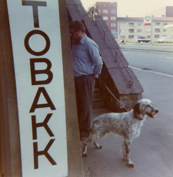 Mann med hund ved tobakk-skilt.