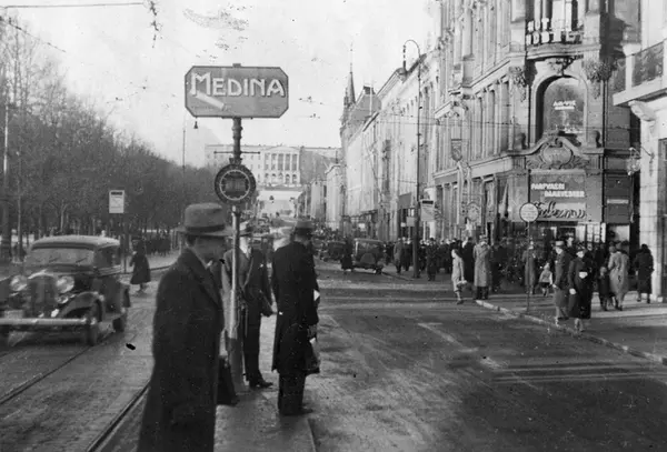Skilt med reklame for Medina sigaretter på Karl Johans gate i Oslo.