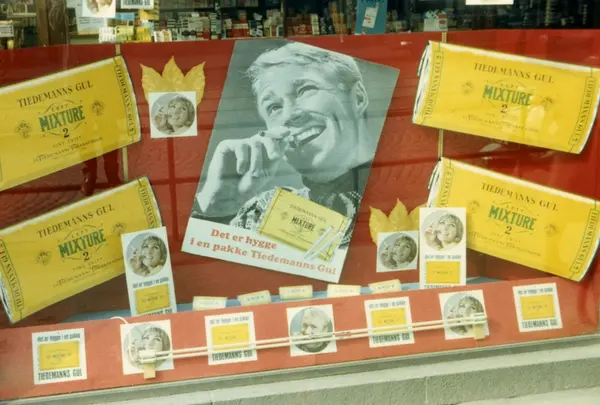 Vindusutstilling med reklame for Tiedemanns Gul hos Majoren Tobakk i Oslo.