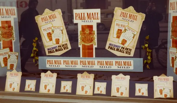 Vindusutstilling hos Majoren Tobakk med reklame for Pall Mall sigaretter.