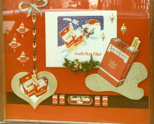 Vindusutstilling med reklame for South State sigaretter hos Majoren Tobakk.