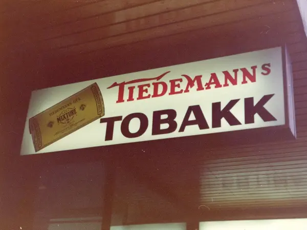 Skilt, reklame for Tiedemanns Tobakk på Storgata i Oslo.