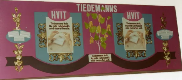 Foto fra Tiedemanns reklame- og tobakksmuseum. Samlingen består av gjenstander, fotografier og arkivalia knyttet til J. L. Tiedemanns Tobaksfabrik (etablert 1778). Fabrikken var en sentral og ledende aktør innen nærings- og nytelsesmiddelindustrien, og utgjør et langt og viktig kapittel i norsk industrihistorie. Tiedemanns Tobaksfabrik la ned produksjonen i 2008, etter 230 års virksomhet. Norsk Folkemuseum overtok Tiedemanns reklame- og tobakksmuseum i 2010.