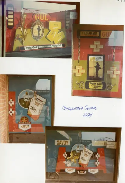 Fotomontasje, vindusutstillinger med reklame for forskjellige produkter fra Tiedemann hos Manglerud Super i 1974.