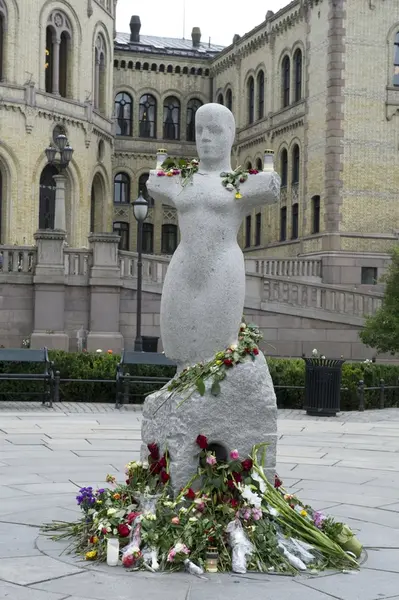 "Sorg i det offentlige rom". Blomster og lys ved statue utenfor Stortinget.