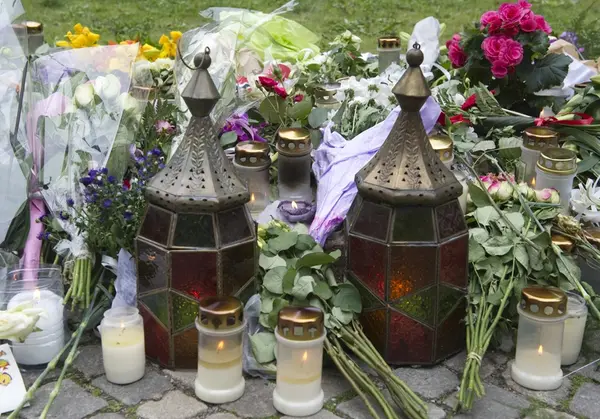 "Sorg i det offentlige rom". Blomster, lys, lykter og hilsener ved Oslo Domkirke.