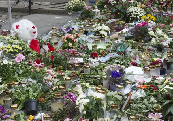 "Sorg i det offentlige rom". Blomster, lys, bamse og hilsener ved Oslo Domkirke.