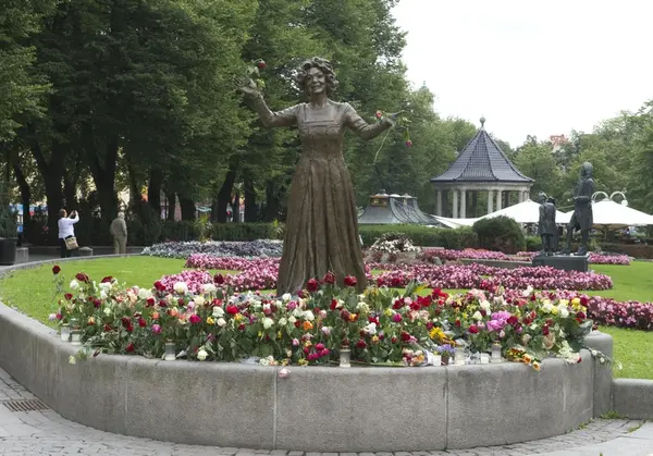 "Sorg i det offentlige rom". Blomster, lys og hilsener lagt ned ved Per Ungs statue av Wenche Foss utenfor Nationaltheatret.