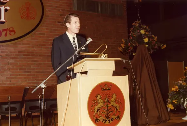 Johan H. Andresen på talerstolen. Selskapslokale. Tiedemanns Tobaksfabriks 200-årsjubileum i 1978.