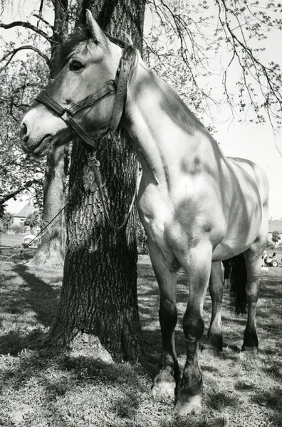 Hest bundet fast i et tre utenfor fabrikken. Tiedemanns tobakksvogner i forbindelse med Tiedemanns Tobaksfabriks 200-årsjubileum i 1978.