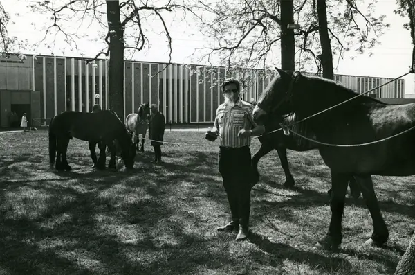 Hester bundet fast i trær utenfor fabrikken. Tiedemanns tobakksvogner i forbindelse med Tiedemanns Tobaksfabriks 200-årsjubileum i 1978.