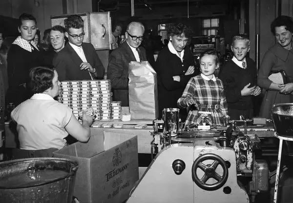 Omvisning i fabrikken. Familiedag hos Tiedemanns Tobaksfabrik i Stensberggate 1959.