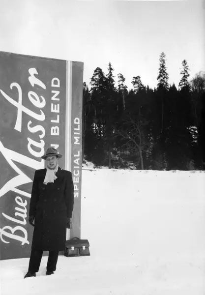 Vinter-OL 1952. Helikopterreklame under hopprenn. Mann foran stort reklameskilt for Blue Master sigaretter.