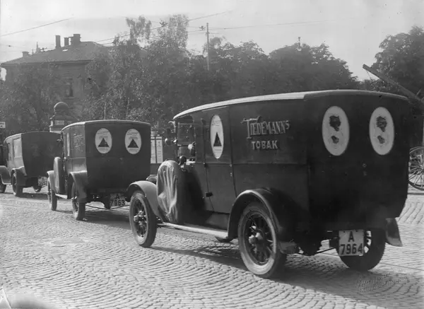 Biler fra J. L. Tiedemanns Tobaksfabrik i et reklameopptog høsten 1926.