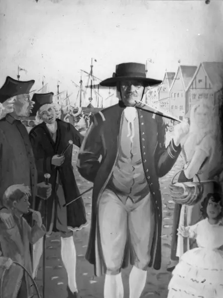 Foto fra Tiedemanns 150-års jubileum i 1928. Publikum kunne bli gratis portrettert med sitt ansikt kikkende gjennom en av Tiedemanns reklameplakater.