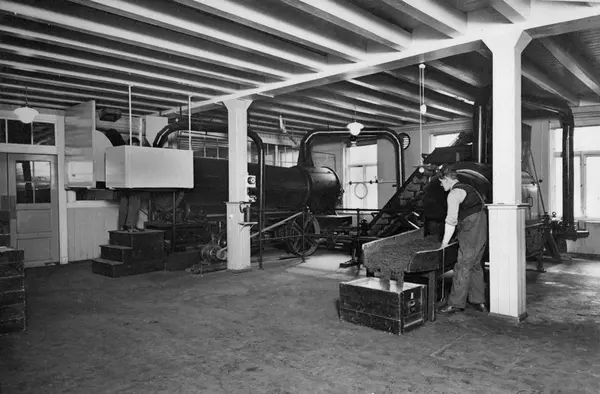Tørking og kjøling av sigarettobakk. Produksjon av tobakk hos Tiedemanns Tobaksfabrik i Stensberggaten på 1930-tallet.