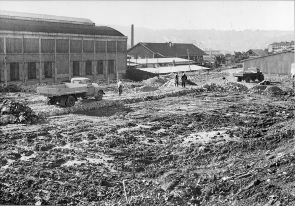 Tomt til Tiedemanns første lagerbygning på Kampen (Kampen I) 1951. I bakgrunnen Kampen stålverk. Foto fra byggearbeider foretatt ved J. L. Tiedemanns Tobaksfabrik på Kampen fra sommeren 1951 frem til høsten 1955.