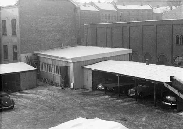 Tekst fra album: "Bedriftens snekkere samt kartonasjeavdelingen holdt til i kjelleretasjen i Falbesgt. Dette var i lengden uholdbart, og senhøstes 1953 gikk man inn for å rette på dette forholdet." "Julen 1953 var snekkerverkstedet ferdig. Skuret hvor bilene står skal rives, for å gi plass til ny kartonasjeavdeling." Foto fra byggearbeider foretatt ved J. L. Tiedemanns Tobaksfabrik fra sommeren 1951 frem til høsten 1955. Flere avdelinger arbeidet under mindre gode forhold, og det var mange problemer som måtte løses for å få tidsmessige og gode lagringsforhold. Foto fra Tiedemanns reklame- og tobakksmuseum. Samlingen består av gjenstander, fotografier og arkivalia knyttet til J. L. Tiedemanns Tobaksfabrik (etablert 1778). Fabrikken var en sentral og ledende aktør innen nærings- og nytelsesmiddelindustrien, og utgjør et langt og viktig kapittel i norsk industrihistorie. Tiedemanns Tobaksfabrik la ned produksjonen i 2008, etter 230 års virksomhet. Norsk Folkemuseum overtok Tiedemanns reklame- og tobakksmuseum i 2010.