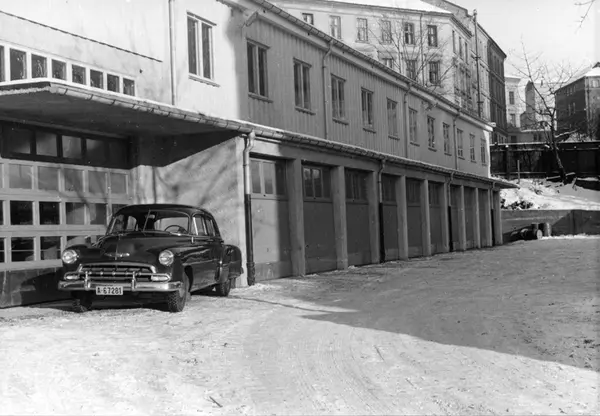 Garasje- og lagerbygning i Holbergsgate 1, Oslo, 1955. Foto fra byggearbeider foretatt ved J. L. Tiedemanns Tobaksfabrik fra sommeren 1951 frem til høsten 1955. Bil av typen Chevrolet 1952.