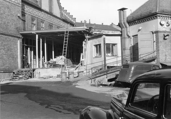 Tekst fra album: "Arbeidernes oppholdsrum i lunch-pausen, garderobeforhold etc. var ting som måtte rettes på. En hel ominnredning av Møllerbygningen ble planlagt og arbeidet igangsatt i januar 1955." Foto fra byggearbeider foretatt ved J. L. Tiedemanns Tobaksfabrik fra sommeren 1951 frem til høsten 1955. Flere avdelinger arbeidet under mindre gode forhold, og det var mange problemer som måtte løses for å få tidsmessige og gode lagringsforhold. Foto fra Tiedemanns reklame- og tobakksmuseum. Samlingen består av gjenstander, fotografier og arkivalia knyttet til J. L. Tiedemanns Tobaksfabrik (etablert 1778). Fabrikken var en sentral og ledende aktør innen nærings- og nytelsesmiddelindustrien, og utgjør et langt og viktig kapittel i norsk industrihistorie. Tiedemanns Tobaksfabrik la ned produksjonen i 2008, etter 230 års virksomhet. Norsk Folkemuseum overtok Tiedemanns reklame- og tobakksmuseum i 2010.