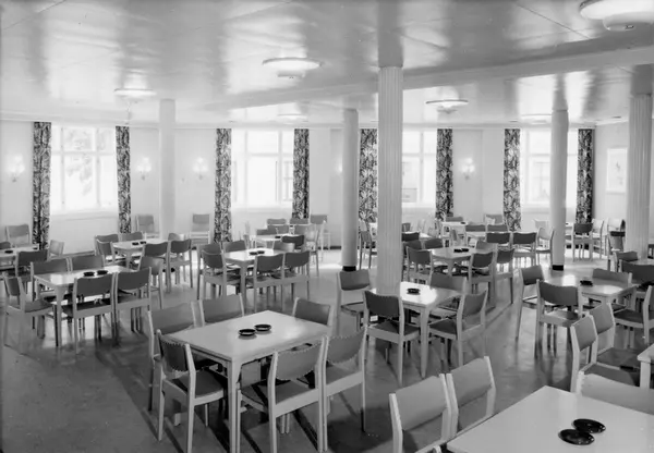 Interiør fra den nye spise- og forsamlingssal hos Tiedemanns Tobaksfabrik i Stensberggata i 1955. Foto fra byggearbeider foretatt ved J. L. Tiedemanns Tobaksfabrik fra sommeren 1951 frem til høsten 1955.