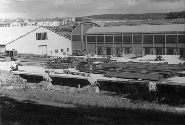 Transport av stålkontruksjon. Konstruksjon av lagerbygning på Kampen i Oslo, Kampen III, i 1953.