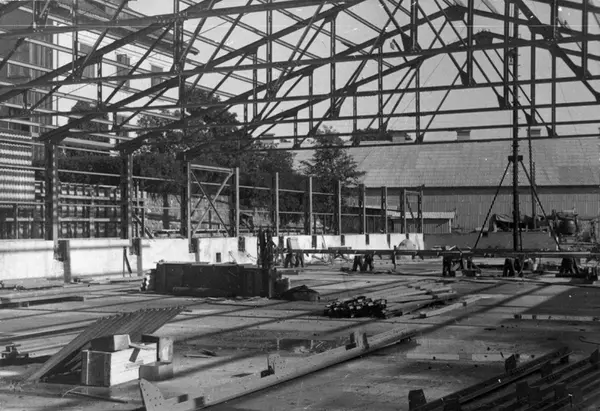 Montasje av stålkonstruksjon 01.08.1953. Konstruksjon av lagerbygning på Kampen i Oslo, Kampen III, i 1953.