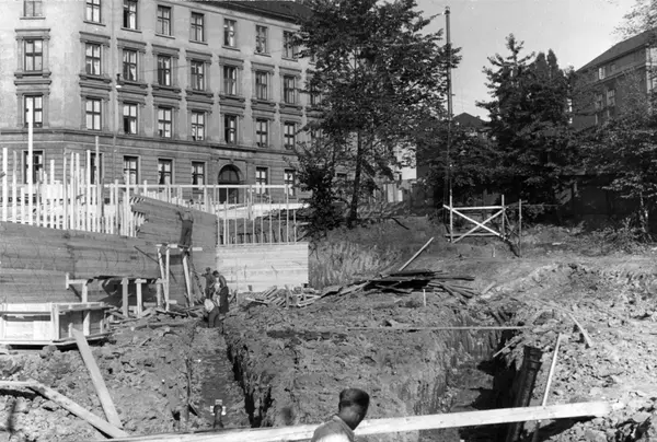 Konstruksjon av garasje og lager ved Tiedemanns Tobaksfabrik i Stensberggate i 1954.
