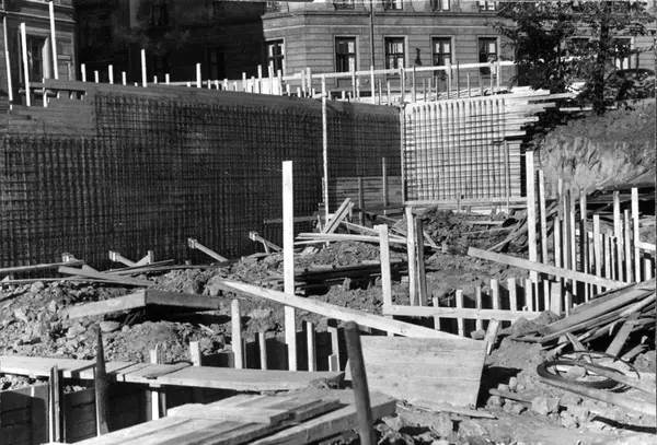 Konstruksjon av garasje og lager ved Tiedemanns Tobaksfabrik i Stensberggate i 1954.
