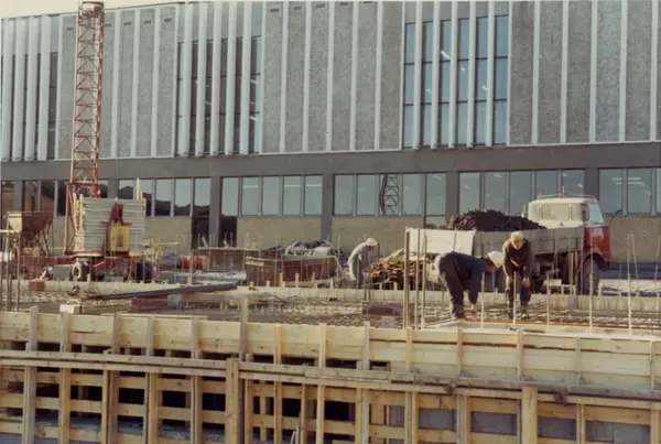 Byggeplass. Konstruksjon av Tiedemanns Tobaksfabrik på Hovin i 1969.