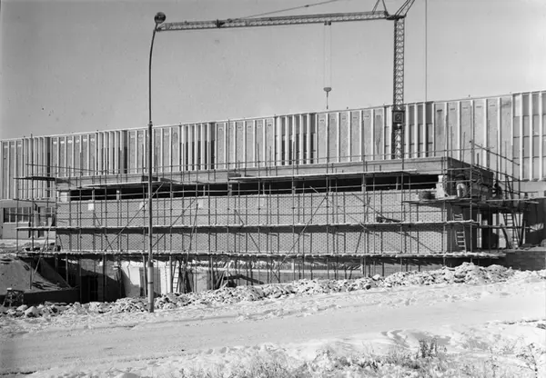 Byggeplass. Konstruksjon av Tiedemanns Tobaksfabrik på Hovin i 1969.