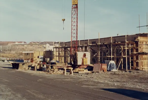 Byggeplass. Konstruksjon av Tiedemanns Tobaksfabrik på Hovin i 1969.