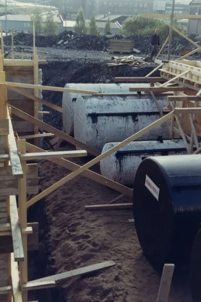 Byggeplass. Konstruksjon av Tiedemanns Tobaksfabrik på Hovin i 1969.