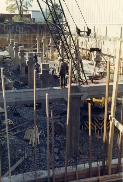 Byggeplass. Konstruksjon av Tiedemanns Tobaksfabrik på Hovin i 1969.