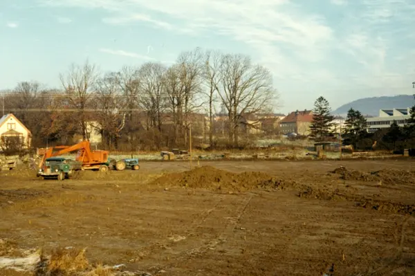 Byggeplass. Konstruksjon av Tiedemanns Tobaksfabrik på Hovin i 1966. Gravemaskinen er en Brøyt (norskprodusert). Traktoren kan være en Ford.