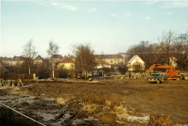 Byggeplass. Konstruksjon av Tiedemanns Tobaksfabrik på Hovin i 1966.