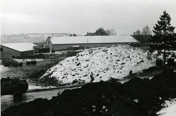 Byggeplass. Konstruksjon av Tiedemanns Tobaksfabrik på Hovin i 1967.
