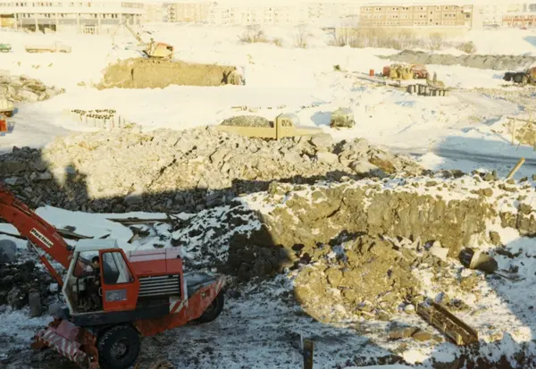Byggeplass. Konstruksjon av Tiedemanns Tobaksfabrik på Hovin i 1967.