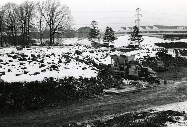 Byggeplass. Konstruksjon av Tiedemanns Tobaksfabrik på Hovin i 1967.