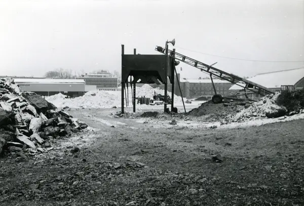 Byggeplass. Konstruksjon av Tiedemanns Tobaksfabrik på Hovin i 1967.