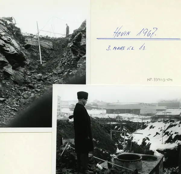 Byggeplass. Konstruksjon av Tiedemanns Tobaksfabrik på Hovin i 1967. Dette er et monasje av to fotografier. Det bakre viser Tor Seim som var Administrerende direktør ved Tiedemanns. Det fremre viser Axel Prytz som var Overingeniør ved Tiedemanns fra 1968-1981.