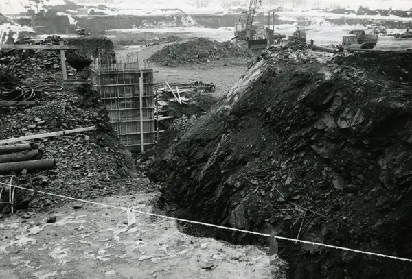 Byggeplass. Konstruksjon av Tiedemanns Tobaksfabrik på Hovin i 1967.