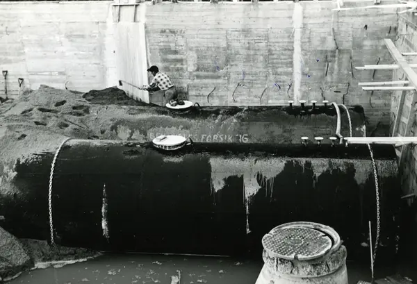 Byggeplass. Konstruksjon av Tiedemanns Tobaksfabrik på Hovin i 1967. En bygningsarbeidere fyller opp med jord kring to store cisterner.