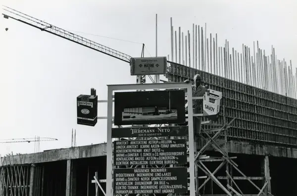 Byggeplass. Konstruksjon av Tiedemanns Tobaksfabrik på Hovin i 1967. Fotografiet viser en man som klatrer på en skilt med informasjon om byggeprosjektet og reklamebilder for Tiedemanns tobakk og sigaretter.