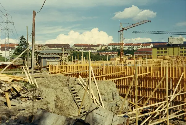 Byggeplass. Konstruksjon av Tiedemanns Tobaksfabrik på Hovin i 1967.