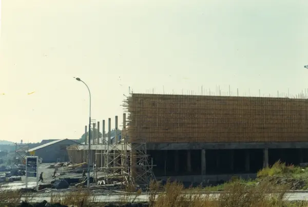 Byggeplass. Konstruksjon av Tiedemanns Tobaksfabrik på Hovin i 1967.