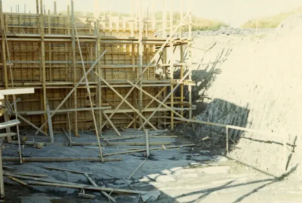 Byggeplass. Konstruksjon av Tiedemanns Tobaksfabrik på Hovin i 1967.
