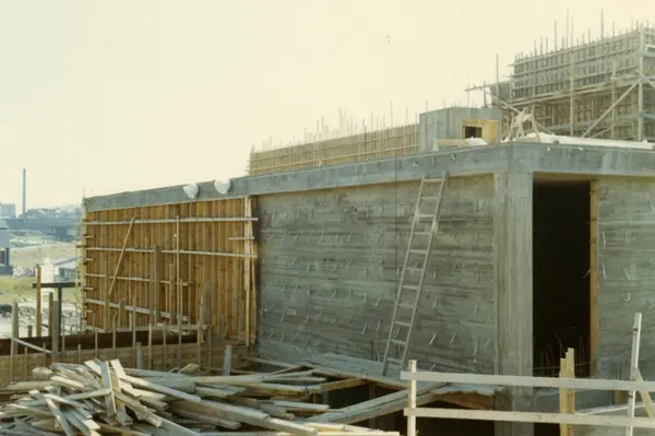 Byggeplass. Konstruksjon av Tiedemanns Tobaksfabrik på Hovin i 1967.