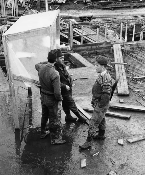 Byggeplass. Konstruksjon av Tiedemanns Tobaksfabrik på Hovin i 1967. Tre stk bygningsarbeidere står på byggeplassen å snakker.
